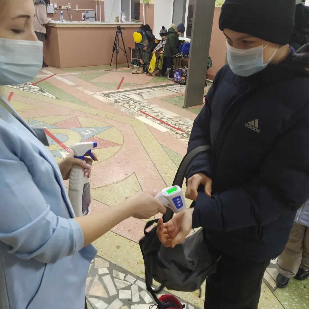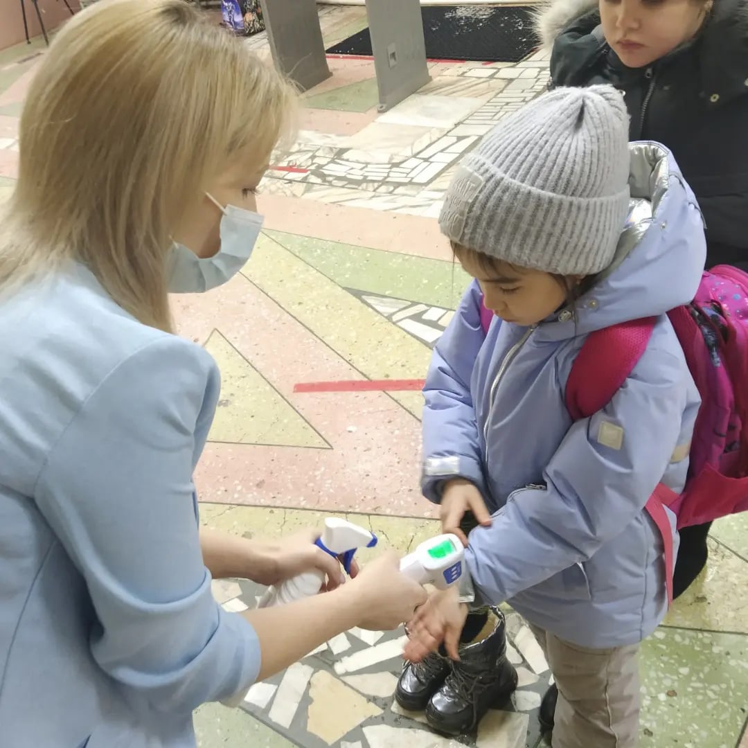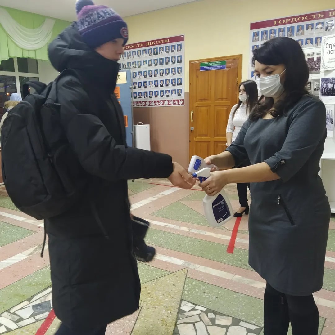 В школе оборудованы 3 входа с термометрией и дезинфекцией рук обучающихся и педагогов. Антиковидные инспектора Гилязова И.Р., Насибуллина Ю.Р., Сафуанова С.А. контролируют соблюдение требований санитарно-эпидемиологических правил в школе ; создают условия для исключения скопления детей при входе в образовательную организацию; условия для личной гигиены; информируют обучающихся и персонал школы о ключевых профилактических мерах. Перед началом занятий всем учащимся школы ответственными лицами измеряется температура тела. При температуре 37,0 и выше с занесением результатов осмотра в специальный журнал термометрии обучающихся, либо при других явных признаках ОРВИ, учащийся не допускается к занятиям, вызываются родители,с которыми он направляется домой для вызова медицинского работника на дом. Согласно инструкции при выявлении обучающегося с признаками коронавируса ответственный работник (медицинская сестра) сообщает директору школы информацию об обучающемся, у которого выявлены подозрения на заболевание новой коронавирусной инфекцией COVID-19, с использованием имеющихся средств связи.
