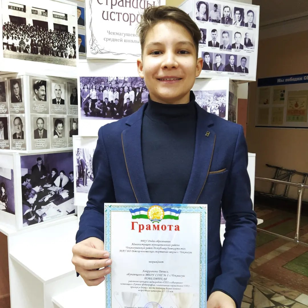 Хайруллин Денис - обучающийся 9в класса МБОУ СОШ N1 села Чекмагуш, ПОБЕДИТЕЛЬ районного конкурса медиаработ "ГТО в объективе" в номинации "Лучшая фотография о выполнении нормативов ГТО - прыжок в длину с места толчком двумя ногами".