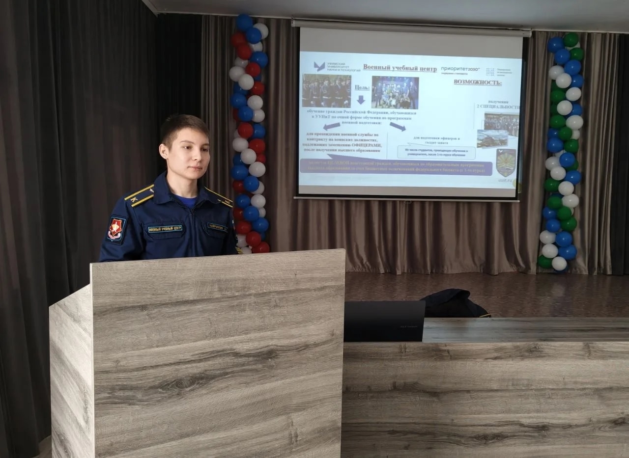 В гости к учащимся 9–11 классов пришёл наш выпускник Хайруллин Денис. Денис — студент 2-го курса Уфимского университета науки и технологий (УУНиТ), проходящий подготовку в Военном учебном центре по специальности «Бортовой авиационный техник вертолёта».