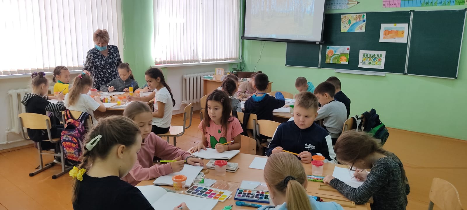 В рамках "Культурной субботы" классные руководители 3-х классов Имангулова Ляля Фоатовна и Васильева Альмира Хамилевна провели внеурочное занятие по ИЗО на тему"Путешествие в осень".В процессе занятия использовались разные формы организации детей, способствующие снятию утомляемости. Ребята с интересом и азартом рисовали, получили удовольствие от занятия.
