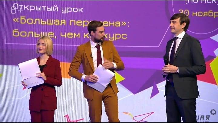 Гостями открытого урока стали министр просвещения Сергей Кравцов, художественный руководитель Московского театра Олега Табакова Владимир Машков и телеведущий Эрнест Мацкявичюс.